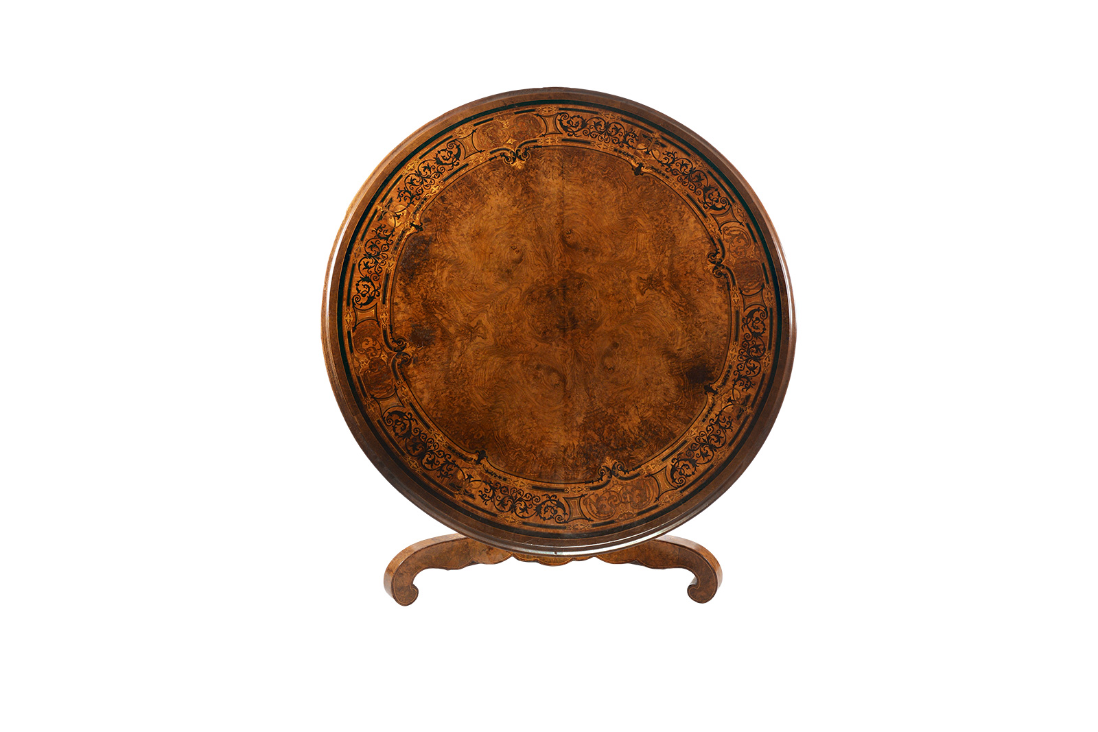 Round tripod pedestal table in burr walnut veneer And headband inlaid with flowering scrolls Tilting tray CIRCA 1880