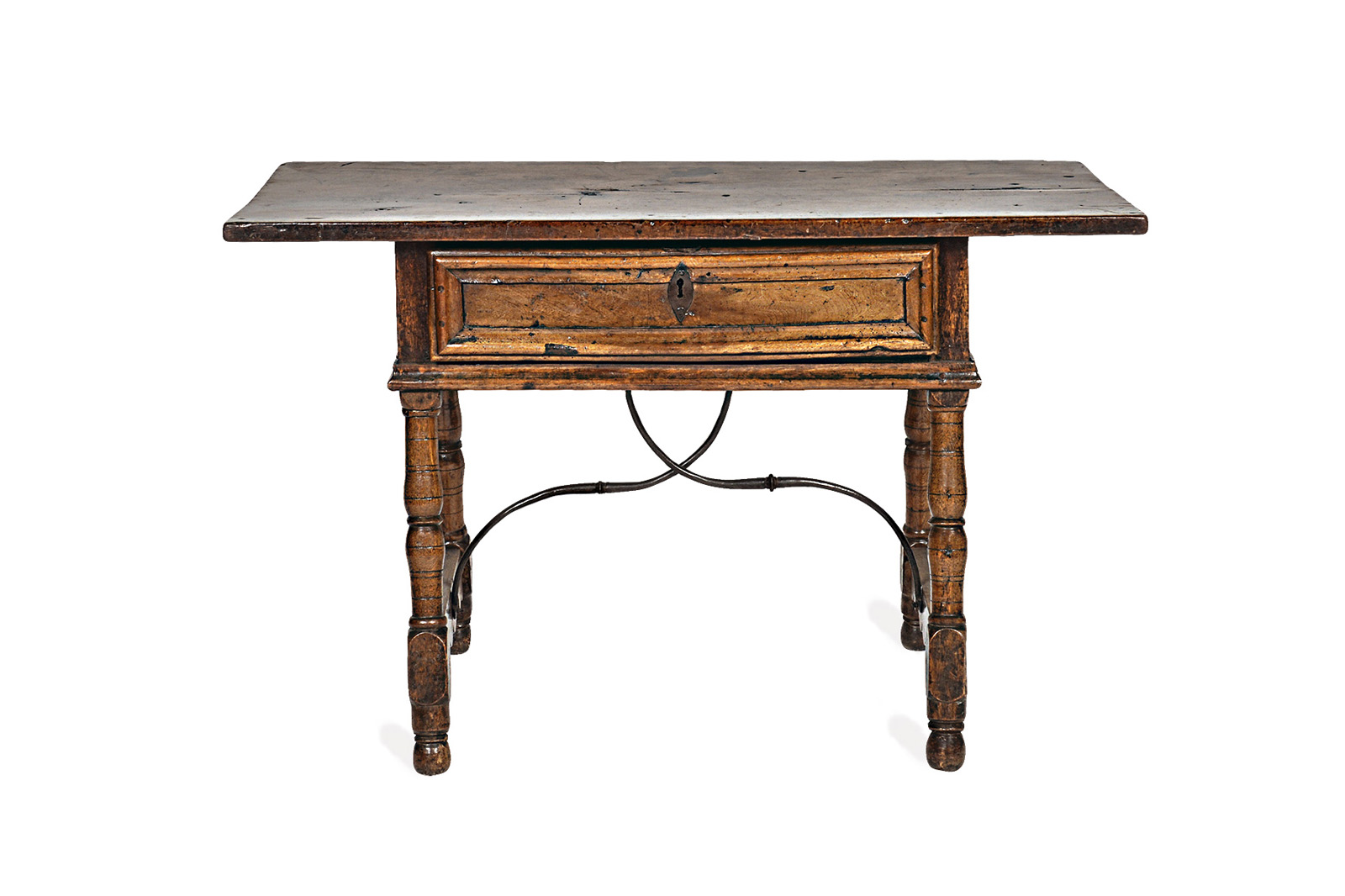 Molded walnut table opening with a drawer belt oak frame With baluster pattern joined by a wrought iron spacer SPAIN XVIIth century CIRCA 1680