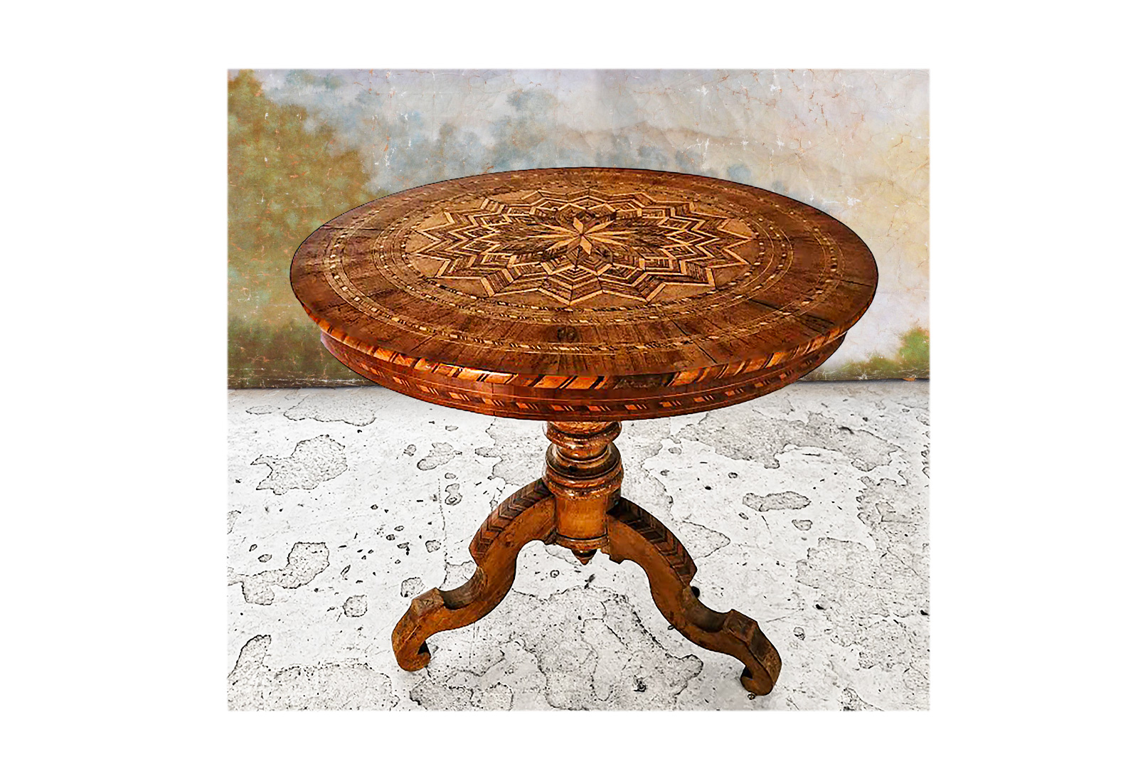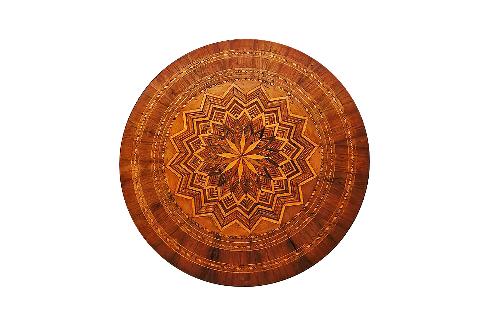 Tripod pedestal table in veneered wood, the circular top decorated with a large geometric rosette surrounded by concentric friezes, the baluster base with three feet 19th century H: 78 cm x Diam: 93 cm