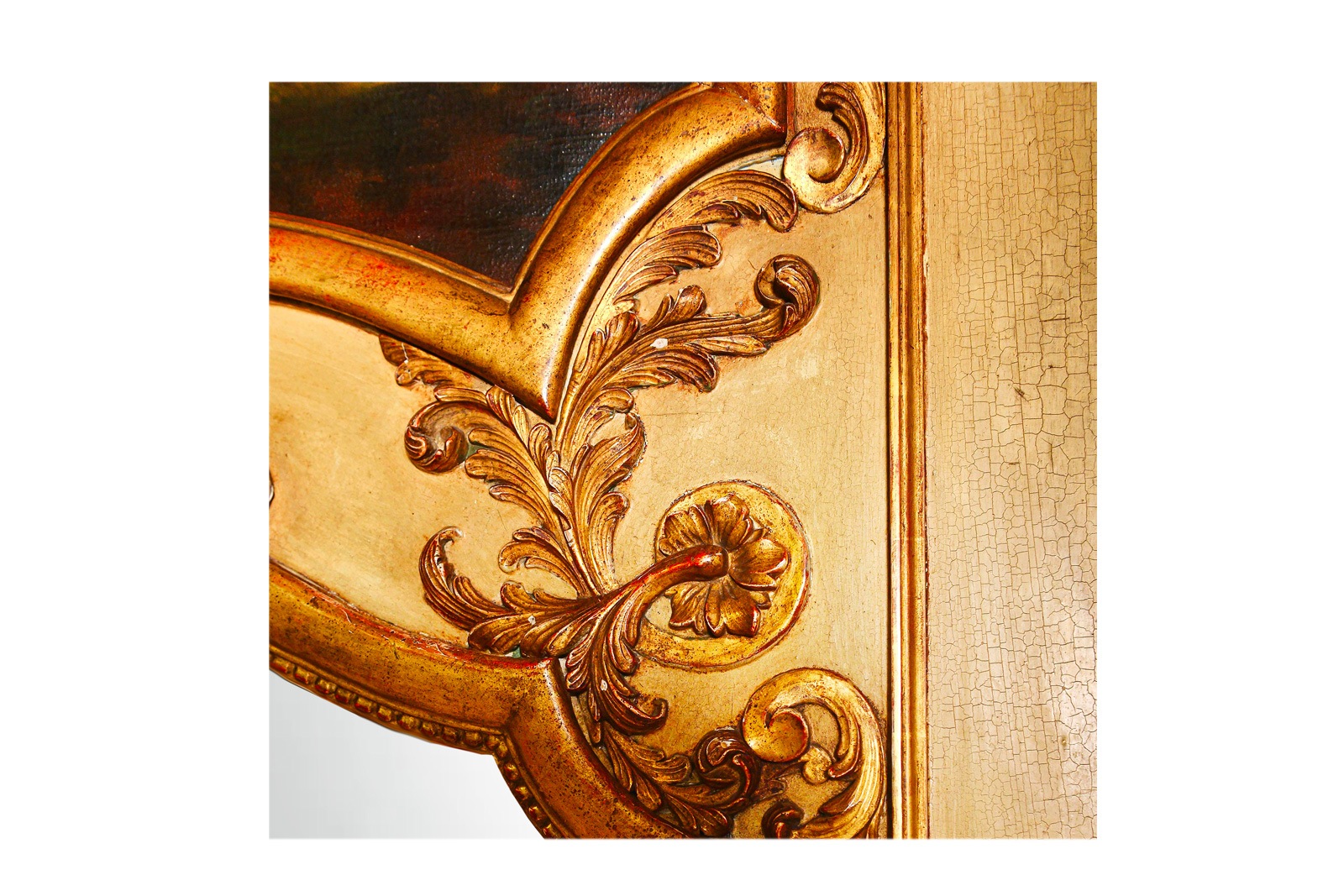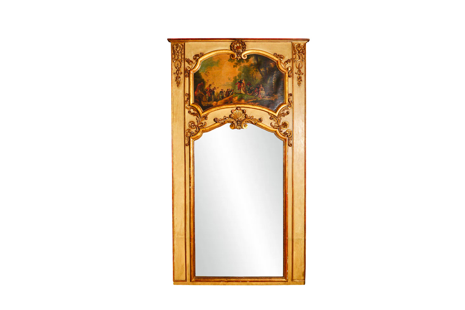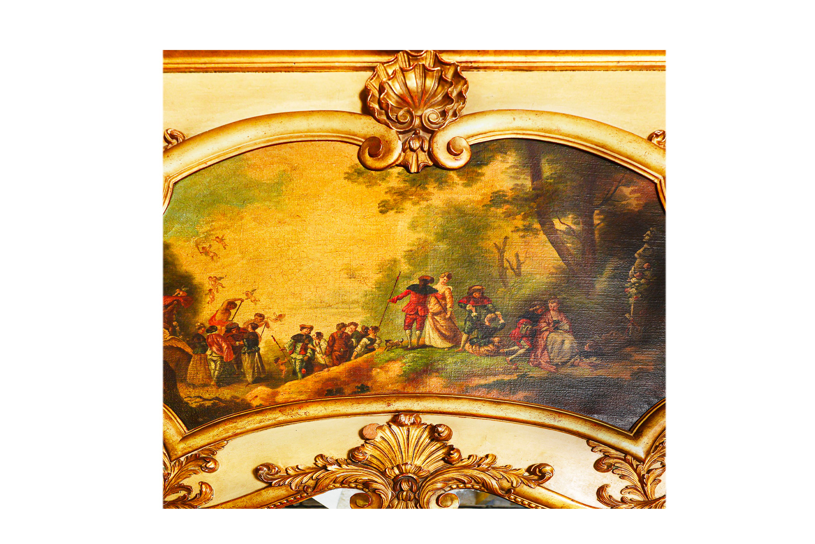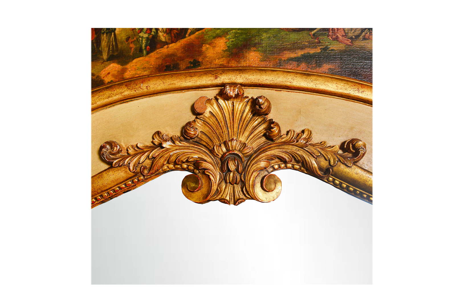 The mirror, surrounded by a frieze of pearls, is surmounted by an oil painting
